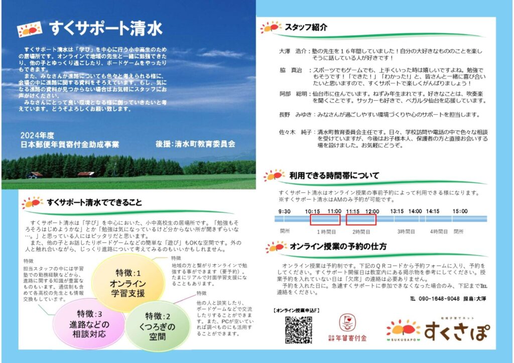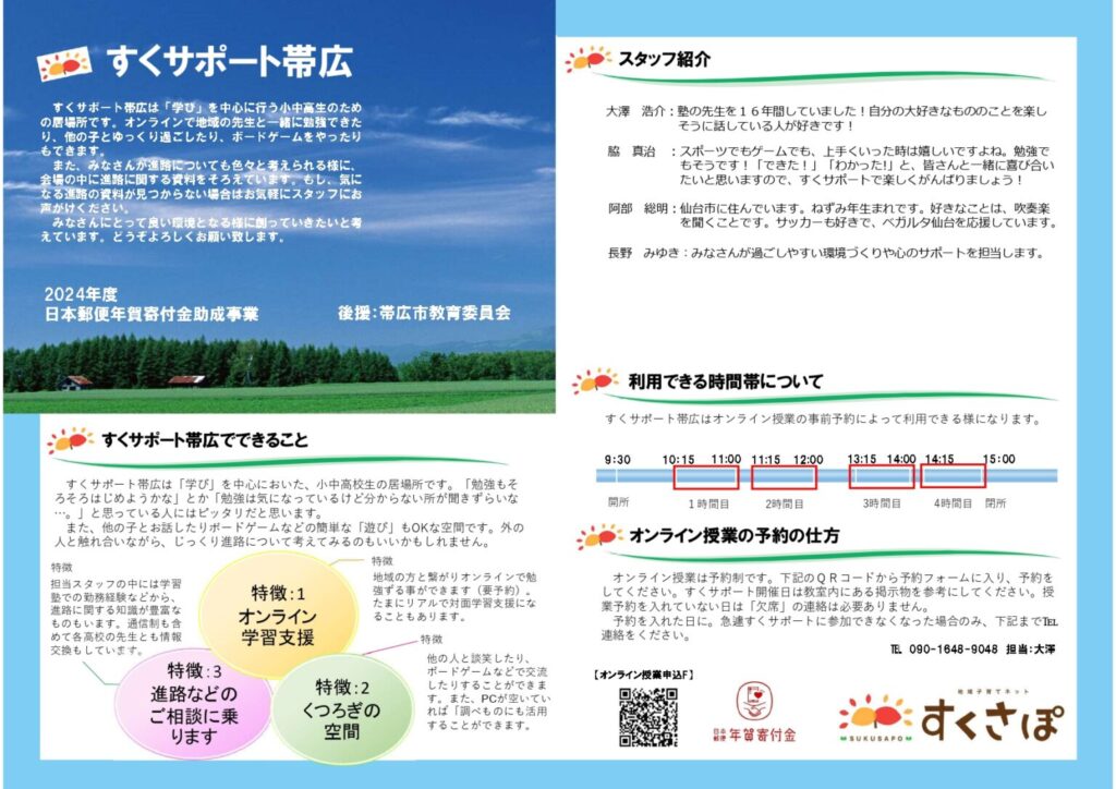 すくサポート帯広・清水は「学び」を中心に行う小中高生のための居場所です。