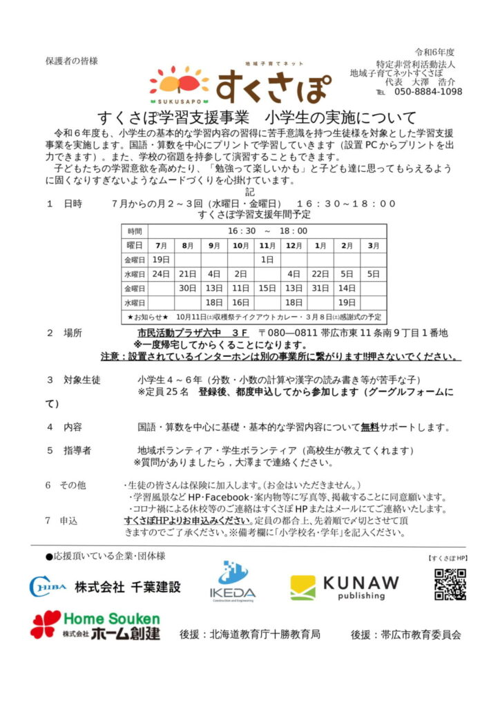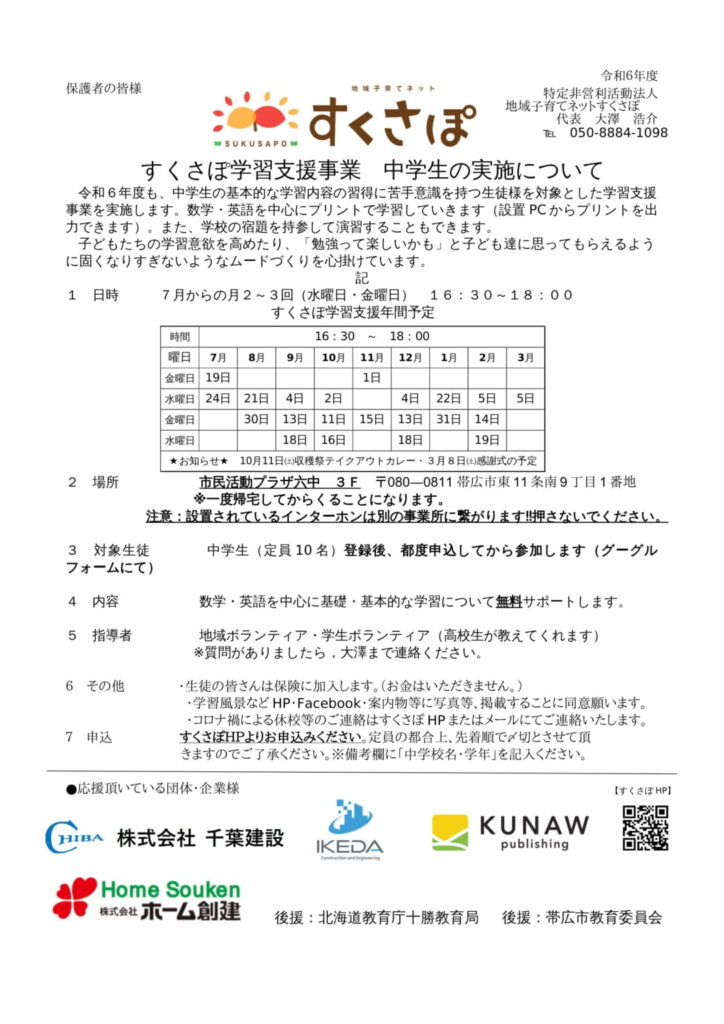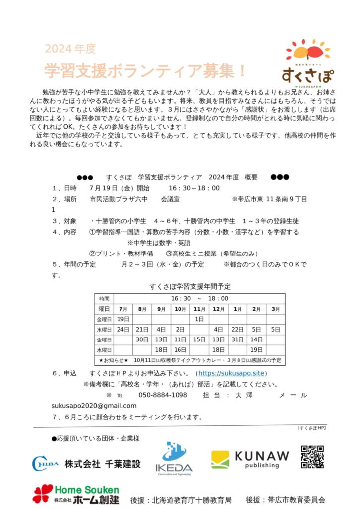 過去のお知らせ 2024.05.042026.03.24 令和6年度の対面学習支援の生徒募集開始! 令和6年度の募集が開始されました。 例年、5月の中旬くらいには定員となってしまいます。 今年は帯広市、音更町、幕別町へ案内プリントを配布させて頂きました。 また、合わせて高校生ボランティアの募集もしています。 たくさんのご応募お待ちしております! 投稿ナビゲーション
