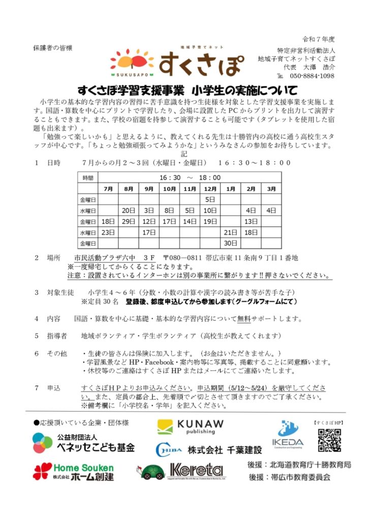 ◯2025年度 すくさぽ対面学習支援小中学生の受付開始![]()